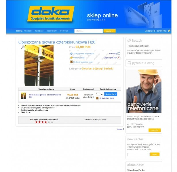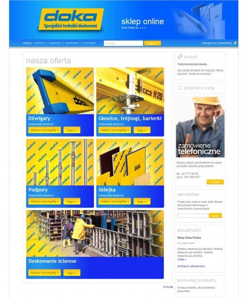 Dokasklep to sklep internetowy stworzony dla firmy Doka Polska Sp. z o.o., czyli polskiego oddziału międzynarodowej firmy Doka specjalizującej się w szalunkach i rusztowaniach budowlanych.